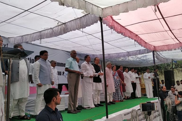 Top opposition figures addressed the New Delhi protest, which was organised by Dravida Munnetra Kazhagam, a regional party from the southern state of Tamil Nadu.