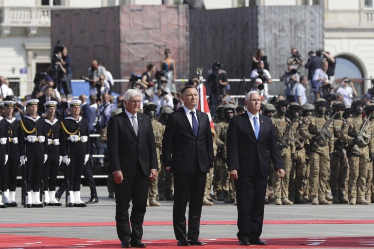 German Chancellor Angela Merkel arrived early, along with the prime ministers of France and Belgium. The presidents of Germany, Slovakia, Croatia, Lithuania, Hungary, Ukraine and the Czech Republic ceremoniously marched onto the stage one by one. US Vice President Mike Pence arrived last but was the only one to be greeted with booming applause from the crowd.