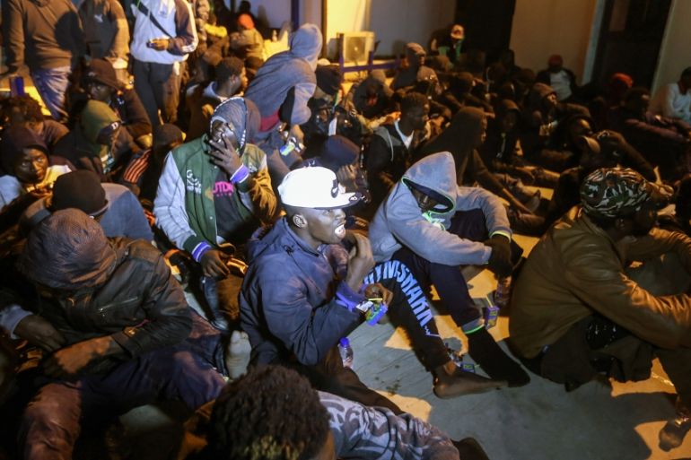 Migrants sait on the floor at a detention centre in Libya''s Tajoura, in the eastern suburbs of the capital Tripoli, late on November 29, 2019, after more than 200 migrants were rescued aboard three ru