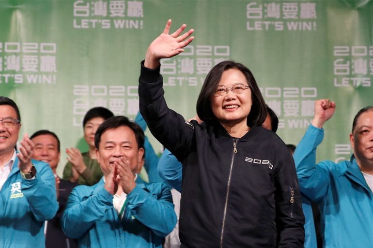 Taiwan President Tsai Ing-wen thanked her supporters after winning a second term in elections on Saturday [Tyrone Siu/Reuters]