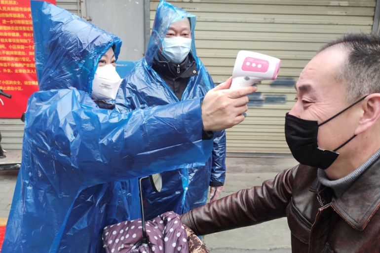 Worker takes body temperature measurement of a man at the entrance to a residential compound following an outbreak of the new coronavirus in Wuhan