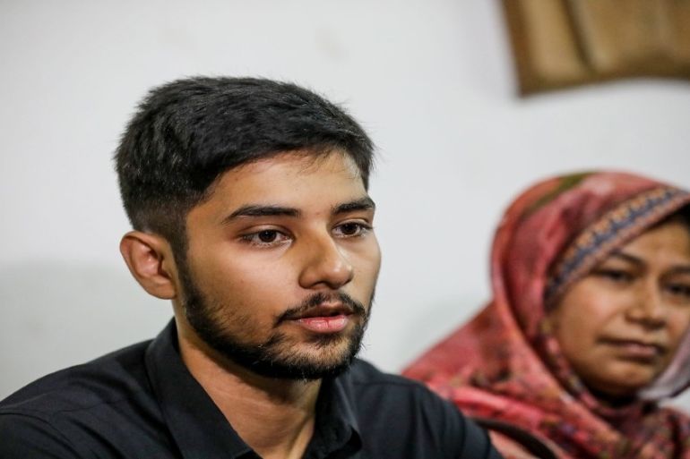 Monorom Polok, son of the recently disappeared journalist Shafiqul Islam Kazal, speaks to reporters at Dhaka's National Press Club [STR/AFP]