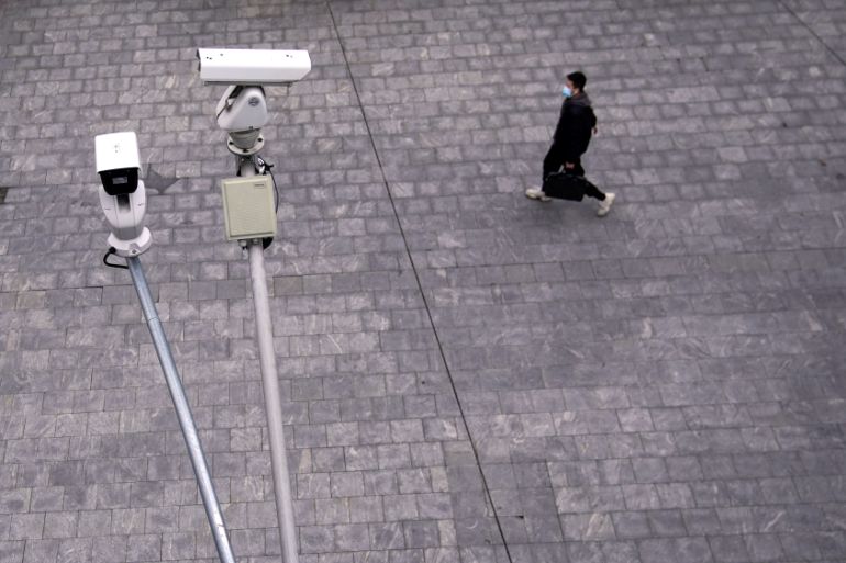 A man wearing a protective mask walks under surveillance cameras in Shanghai, China, on February 28, 2020 [Aly Song/Reuters]