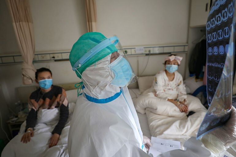 A medical worker inspects a CT scan image at a ward of Wuhan Red Cross Hospital in Wuhan [File: Reuters]