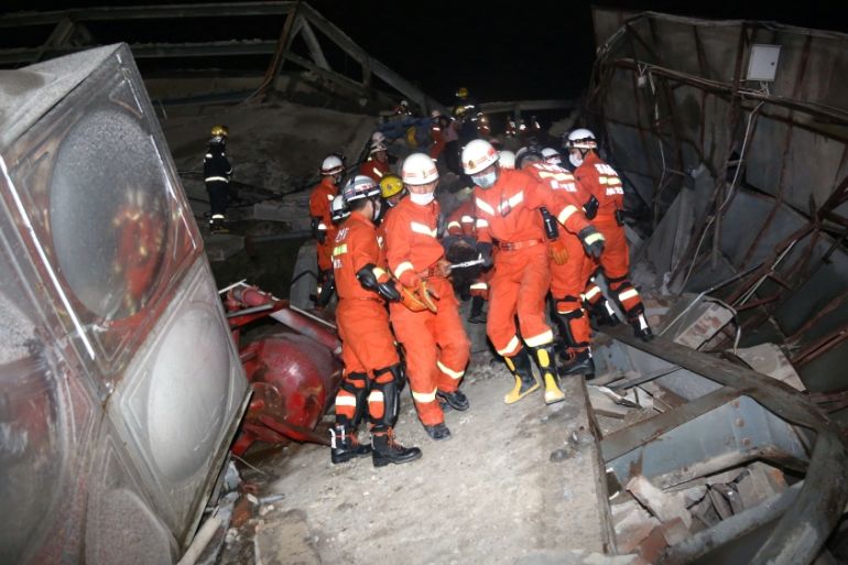 A video stream posted by the government-backed Beijing News site showed rescue workers in orange overalls clambering over rubble and twisted steelwork carrying people towards ambulances.