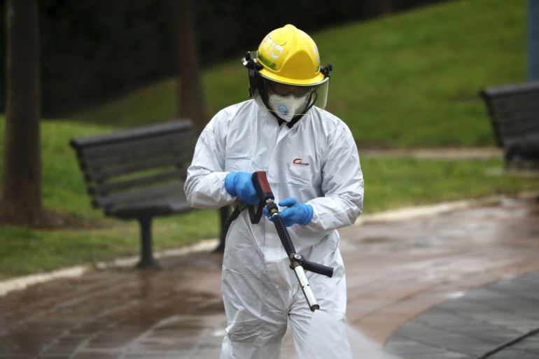 An Israeli firefighter sprays disinfectant as a precaution against the coronavirus in Modiin, Israel [Ariel Schalit/AP]