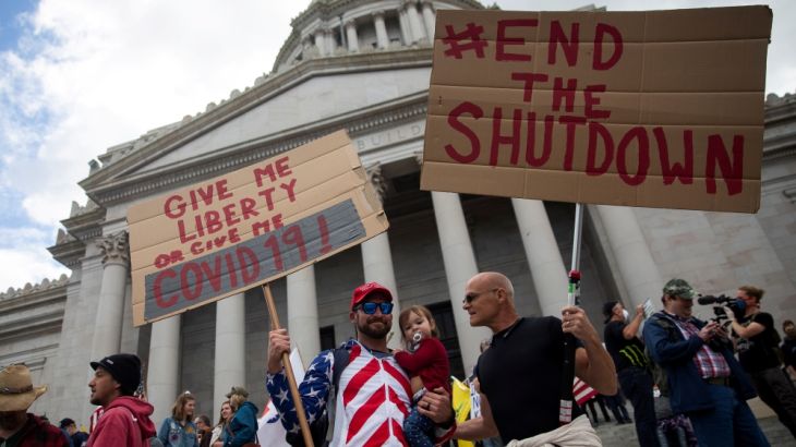 “Shutting down businesses by picking winners and losers in which there are essential and non-essential are violations of the state and federal constitution,” rally organiser Tyler Miller, 39, an engineer from Bremerton, Washington, told Reuters news agency.