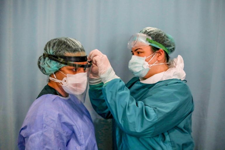 Nurse Dilara Fahrioglu adjusts Kamer Demir''s protective face mask before they start to take care patients suffering from the coronavirus disease (COVID-19) at the intensive care unit of the Medicana I