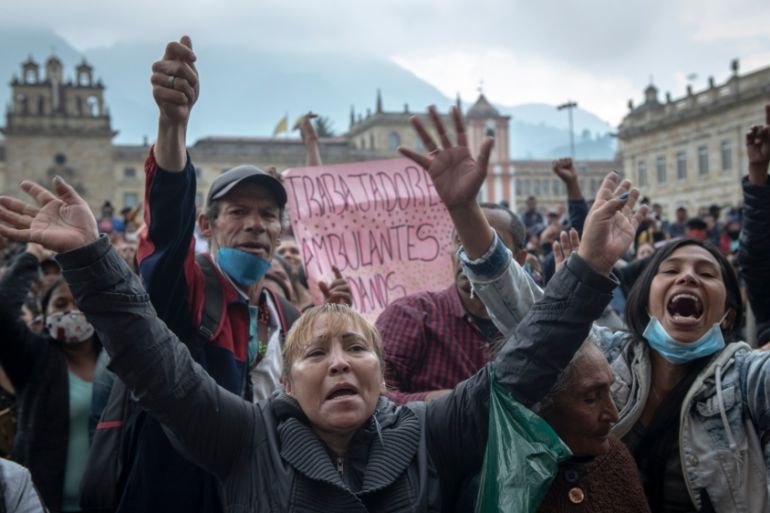 “It’s really hard because what we earn on a daily basis is what we live off – it’s becoming impossible,” Solana said, wearing a face mask she crafted herself from elastic bands and material. She could not justify spending the 2,000 Colombian pesos ($0.50) on a mask.