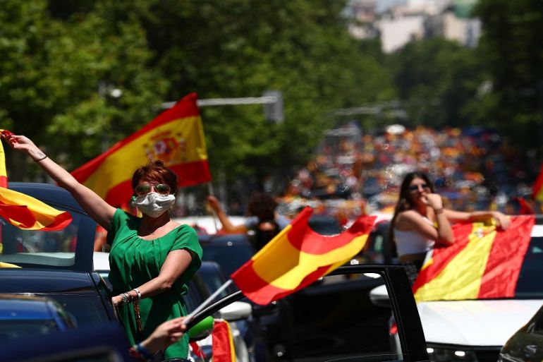 Protesters called for Prime Minister Pedro Sanchez and Deputy Prime Minister Pablo Iglesias to resign over their handling of the coronavirus crisis.