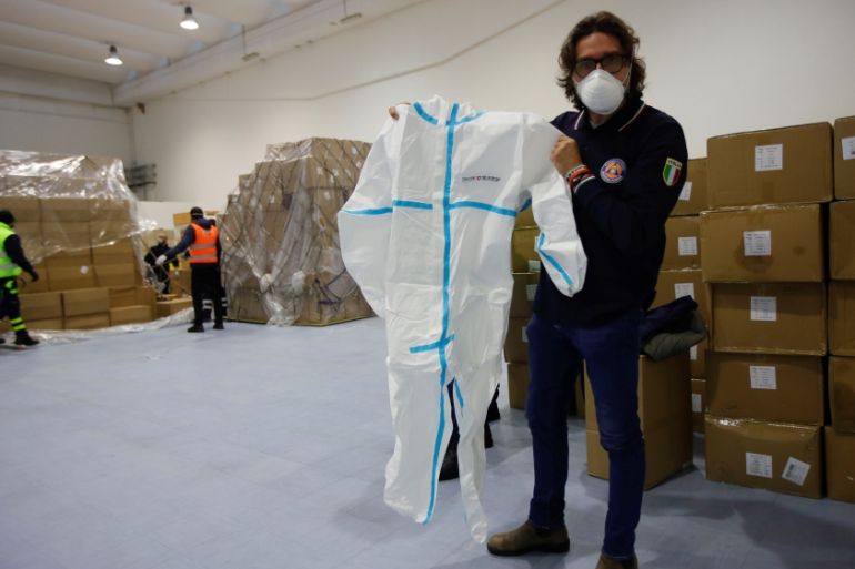 A member of the Italian Civil Protection shows a suit that is part of a shipment of personal protective equipment from China [File: Alessandro Garofalo/Reuters]