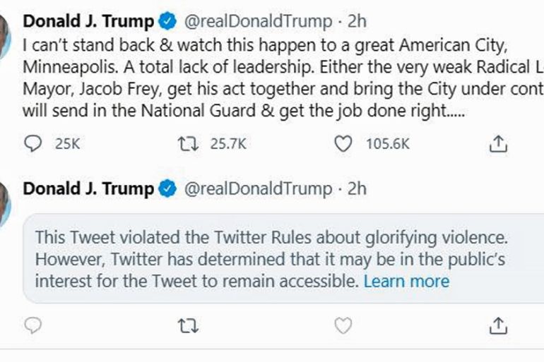 Trump tweeted ‘when the looting starts, the shooting starts’, referring to protests about deadly arrest of George Floyd.