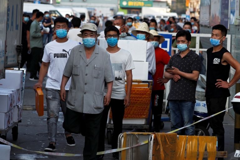 Another six locally transmitted cases were reported on Saturday. Among them were three Xinfadi market workers, one market visitor and two employees at the China Meat Research Center, seven kilometres (four miles) away. One of the employees visited the market last week.