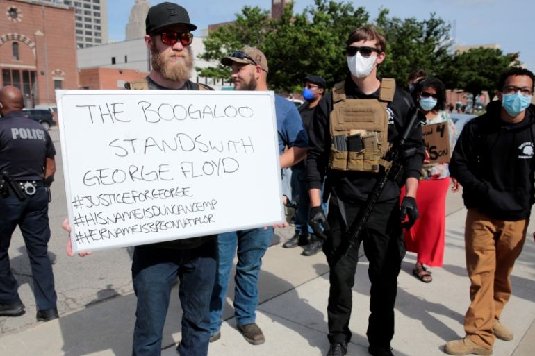 Armed men, one carrying a 'The Boogaloo stands with George Floyd' sign, are seen in Detroit, Michigan as protesters there rally against the death of George Floyd in police custody in Minneapolis, Minnesota, the United States [Rebecca Cook/Reuters]