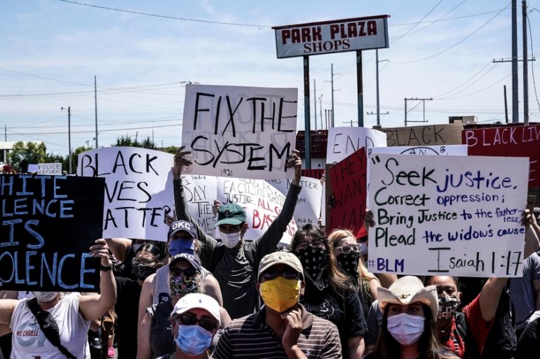 People take part in a Black Lives Matters protest during nationwide unrest following the death in Minneapolis police custody of George Floyd [Nick Oxford/Reuters]