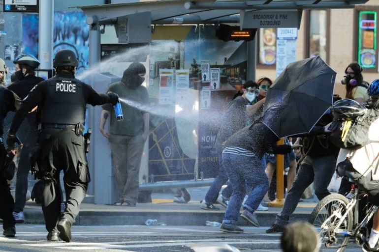 In Seattle, authorities declared a riot following large protests in its Capitol Hill neighbourhood, with police deploying flash bangs and pepper spray to try to clear a weeks-olds “occupied protest zone” that stretches for several blocks. Police had previously cleared the area after two fatal shootings there earlier this month.