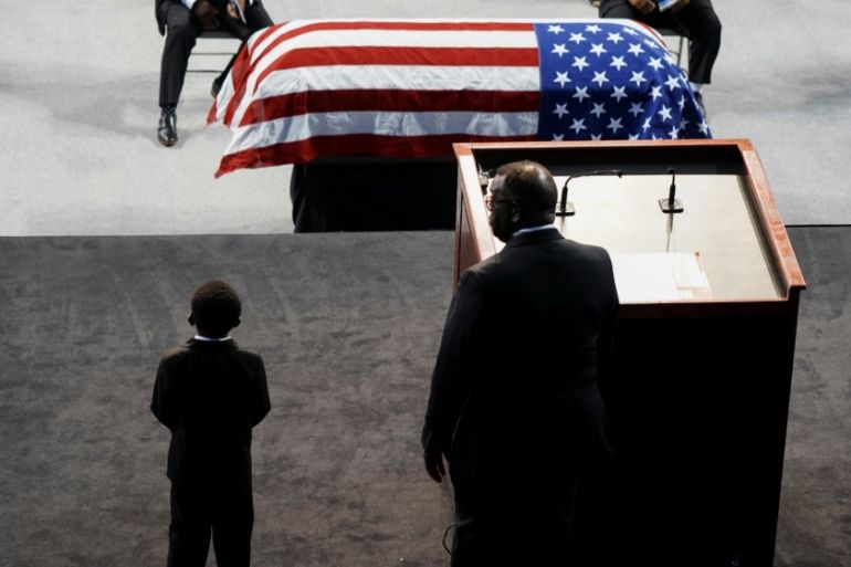On Saturday, members of the public gathered to view Lewis’s body as it lay in state in an arena at Troy University in Alabama, the state of his birth, in a service titled The Boy from Troy, the nickname Reverend Martin Luther King Jr gave Lewis at their first meeting in 1958 in Montgomery.