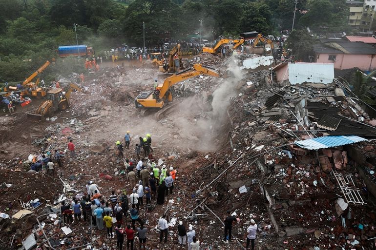 Local residents and police combed through tin sheets, metal rods and other wreckage in a desperate search for survivors as ambulances ferried victims to nearby hospitals amid heavy monsoon rains and fears of COVID-19 infections.