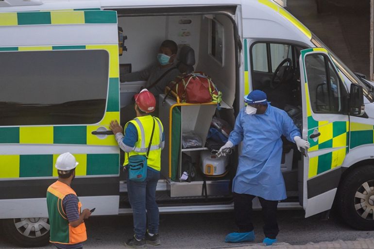 ![Emergency medical workers wearing protection equipment attend to a patient at a construction site in Doha, Qatar, April 05, 2020 [Sorin Furcoi/Global News Insight]](https://www.aljazeera.com/wp-content/uploads/2020/05/c2167fc24d7544298da2f9a39888a77f_18.jpeg?resize=770%2C513&quality=80)