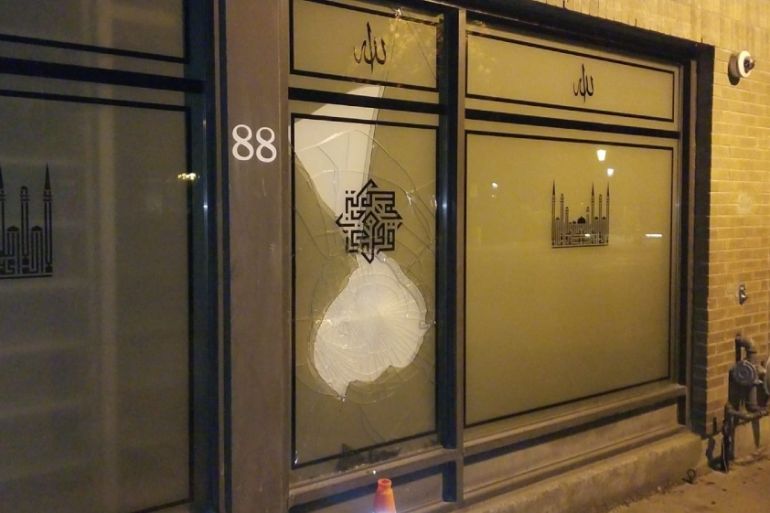 Toronto, Canada – The mosque in downtown Toronto that Hassam Munir, 25, visits regularly has been attacked by vandals numerous times in the past three months, most recently on Sunday, when its windows were found smashed again.
