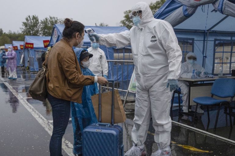 A worker in protective overalls take the temperature of a traveler from Wuhan before directing her to her district in Beijing on Sunday, April 19, 2020. Wuhan, the city at the center of the global cor