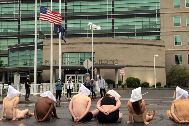 Naked except for “spit hoods” in a reference to the killing of Daniel Prude, several protesters sat outside Rochester’s police headquarters Monday morning to push for police accountability, local news outlets reported.