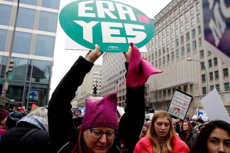 A demonstrator holds a sign calling for the equal rights amendment (ERA) during in the Third Annual Women's March at Freedom Plaza in Washington, US [File: Joshua Roberts/Reuters]