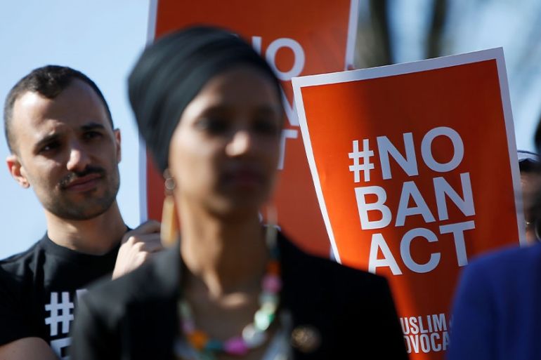 Representative Ilhan Omar stands in front of 'NO BAN ACT' posters during a news conference by members of the US Congress [File: Jim Bourg/Reuters]