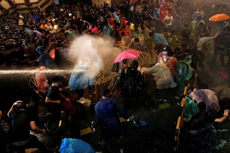 Thai police fired water cannon against protesters on Friday in central Bangkok as the pro-democracy activists defied an emergency decree banning gatherings for a second night running.