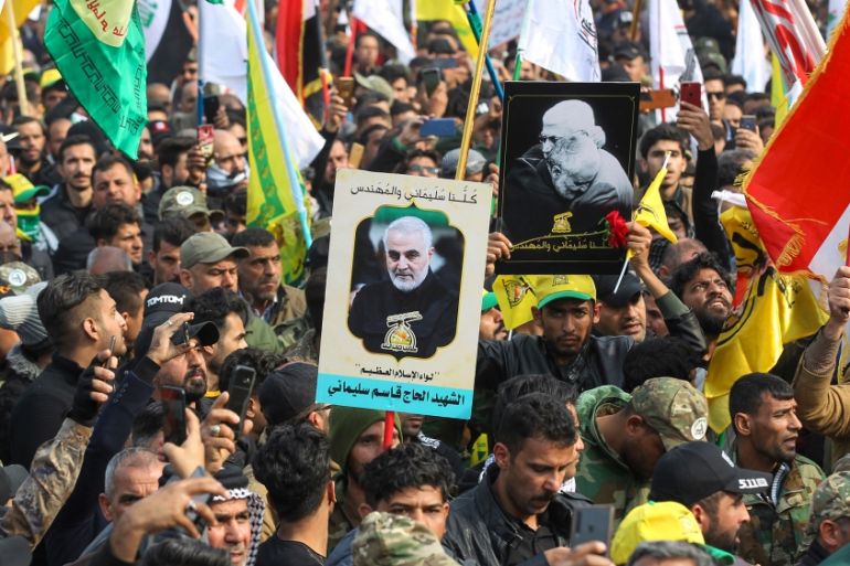Protesters burned Kurdish flags while others carried posters of Iranian general Qassem Soleimani and his Iraqi lieutenant Abu Mahdi al-Muhandis, who were killed in a US drone strike in Baghdad in January 2020.