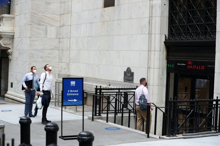 The Dow Jones Industrial Average fell more than 370 points at the opening bell on Wall Street but quickly moved off that low. At about 10am in New York (14:00 GMT), the Dow was down 223.79 points, or less than 1 percent, at 27,593.11.