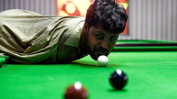 Mohammad Ikram leans over the snooker table, his face at almost touching the white ball as he assesses his options, then hits it with his bearded chin and sends it flying.