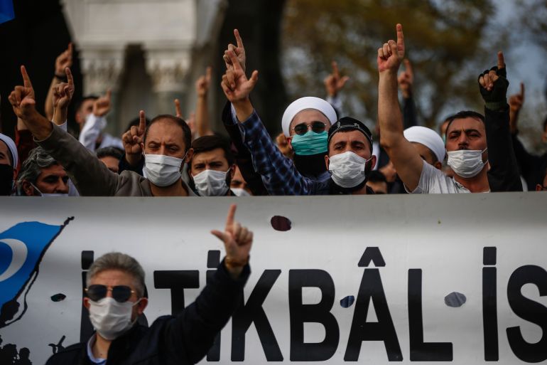 “I don’t normally participate in demonstrations but today I would be ashamed if I did not show my sentiments against this infidel Macron, who supported this insult against our Prophet Muhammad, peace be upon him,” said one protester, Hilal Abudrahman.