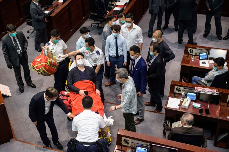 Security guards and pro-Beijing legislators eventually dragged most of the pro-democracy politicians from the chamber and the installation of the committee chair went ahead.