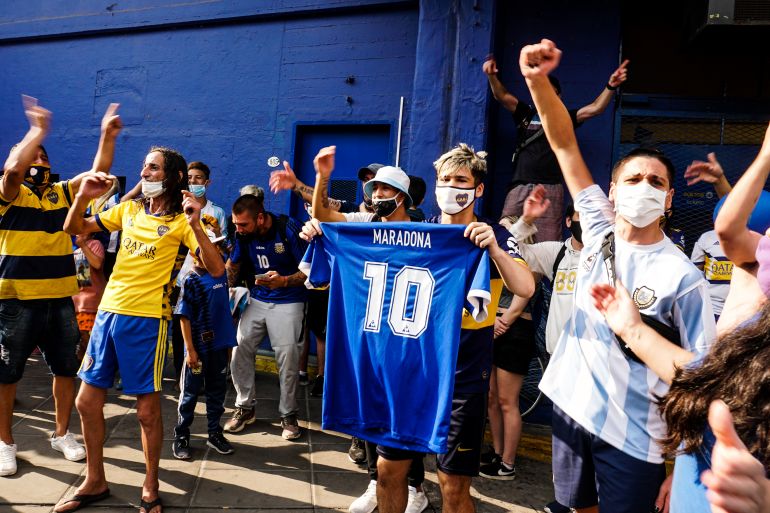 Crowds gathered outside La Bombonera, the home of Boca Juniors, one of Argentina’s most celebrated football clubs, that counted Maradona as its star once.