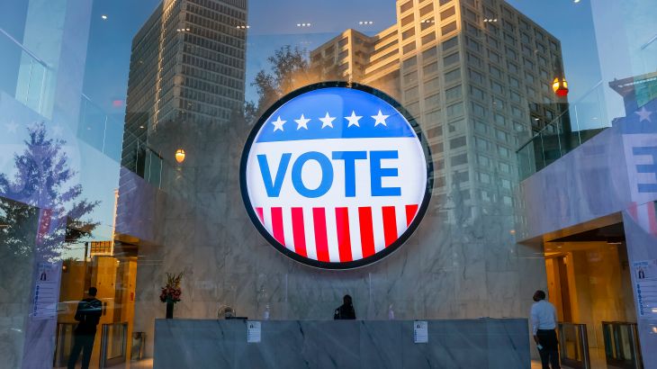 On Election Day, its parking lot is brimming with cars including one with a man playing guitar and singing from the bed of a pick-up truck. The glass doors of the building’s entrance are flanked by two pairs of volunteers wearing yellow crew-neck sweatshirts that read “Election Defender”.
