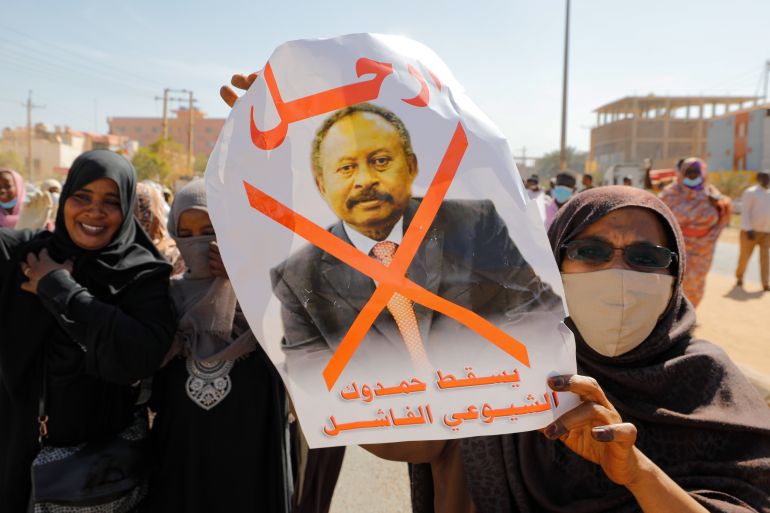 Protesters at Khartoum’s airport held up printed posters of Prime Minister Abdalla Hamdok, his image scored out with the words: “Go away!”