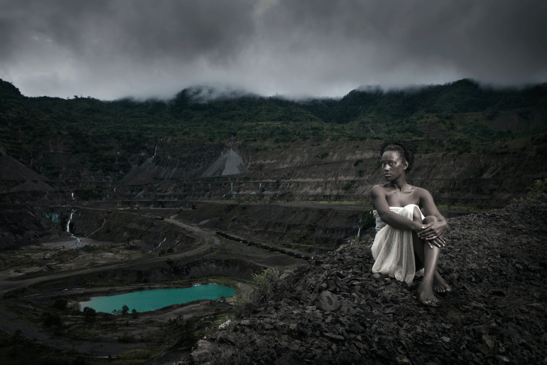 The scene is epic, full of portent. A young woman clothed in white poses enigmatically in the photo’s foreground. Behind her is a vista of denuded mountain slopes and below, a blue pool of water at the bottom of a deep mining pit. Above, sombre grey clouds hang low. It is a picture of dark and light, foreboding and timelessness.