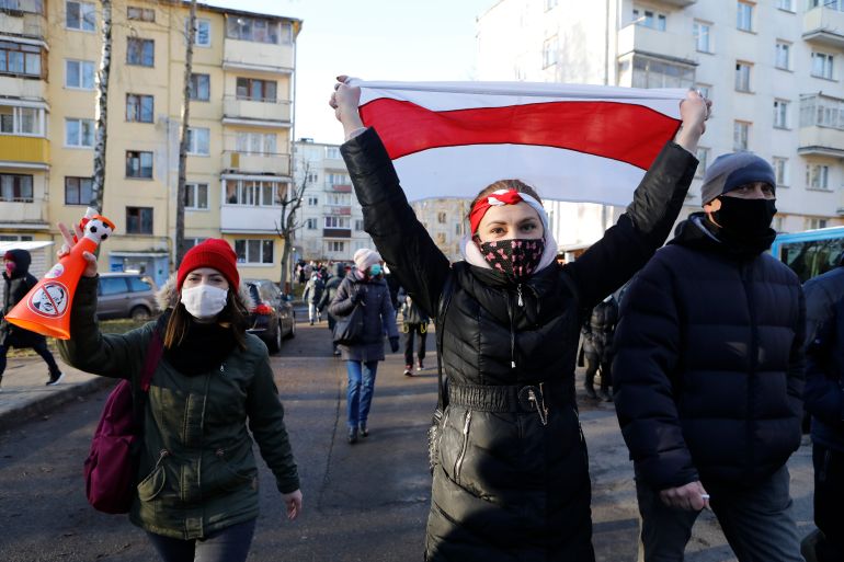 Most protesters marched in remote residential areas of the capital, clapping hands, shouting “long live Belarus”, and waving white flags with a red stripe in the middle, a symbol of the opposition.