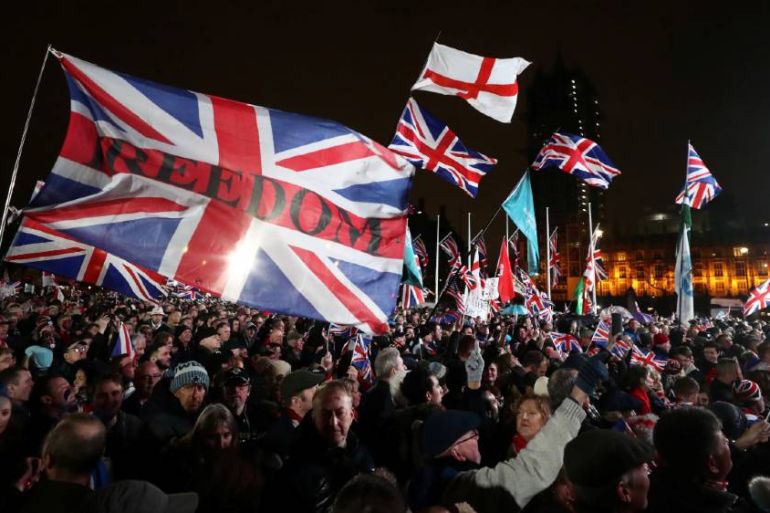 As the clock ticked down the final seconds, thousands of Brexiters celebrated outside Parliament and groups burned EU flags on the streets of London.