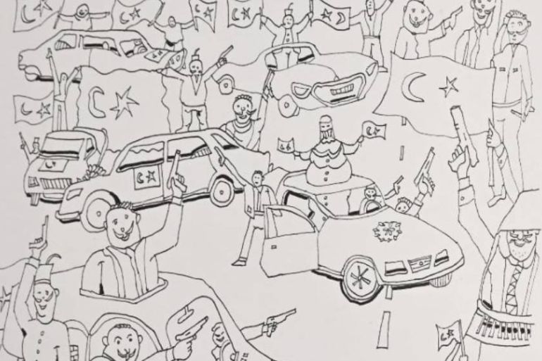 The drawings show men armed with guns waving Turkish flags, and headscarved women surrounded by children.
