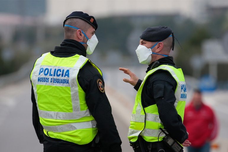 More than 60,000 people in four towns near Barcelona were confined to their homes and with police blocking roads after a coronavirus lockdown was enforced [Joan Mateu/The Associated Press]