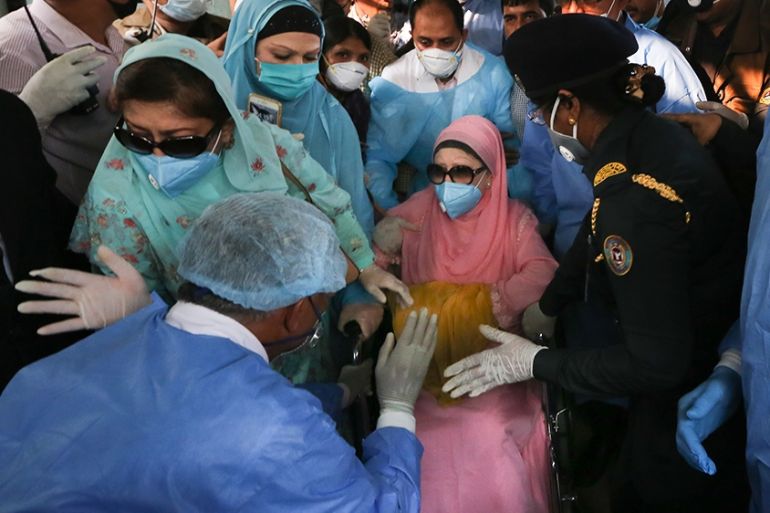 Hundreds of Zia’s supporters greeted her in Dhaka – defying a government ban on public gatherings to contain the coronavirus pandemic – as she emerged in a wheelchair from a hospital where she had been kept in a special cell.