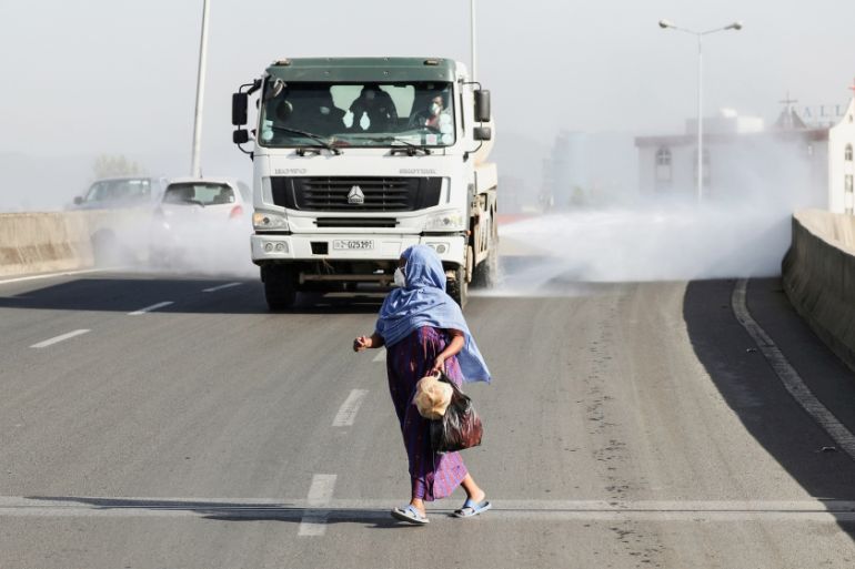 A woman wearing a face mask, runs in front of a truck spraying disinfectant on the street as part of measures to prevent the potential spread of COVID-19 in Addis Ababa, Ethiopia [Tiksa Negeri/Reuters]