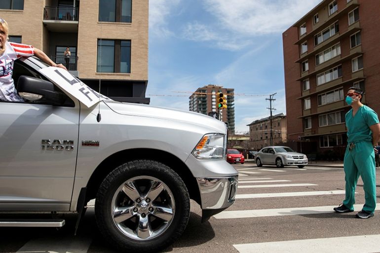 “You go to work. Why can’t I go to work!” a protester can be heard shouting at the medical worker from her truck in the city of Denver.