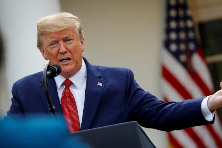 United States President Donald Trump speaking during a news conference in the Rose Garden of the White House in Washington, DC, US. Trump has been giving daily briefings on the coronavirus pandemic [Al Drago/Reuters]