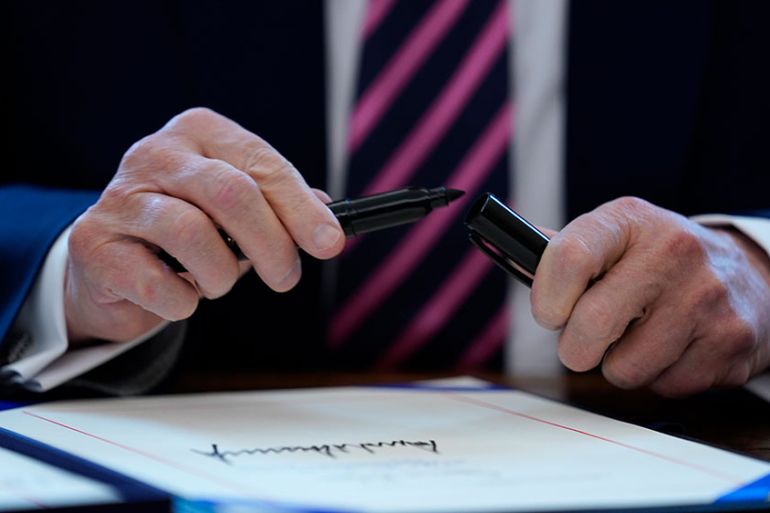 United States President Donald Trump signed a $484bn bill on Friday to aid employers and hospitals under stress from the coronavirus pandemic that has killed more than 50,000 people in the US alone and devastated broad swaths of the economy.