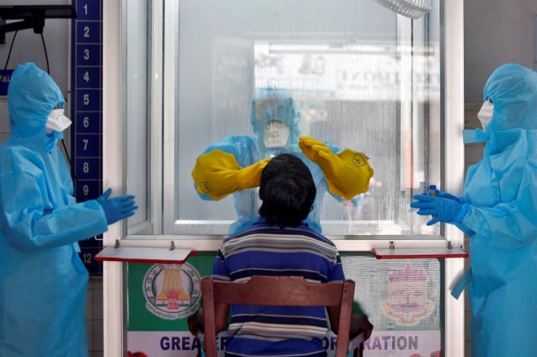 A doctor in a protective chamber takes a swab from a man to test for coronavirus at a walk-in kiosk in a government hospital in Chennai [P Ravikumar/Reuters]