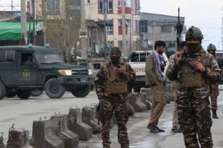 Afghan security personnel stand guard near the site of an attack to a Sikh temple in Kabul on March 25, 2020. The Islamic State group has claimed an attack on a Sikh-Hindu temple