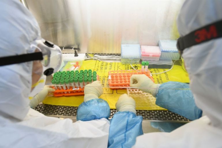 Workers in a laboratory in China examine specimens following an outbreak of the novel coronavirus [File: China Daily via Reuters]